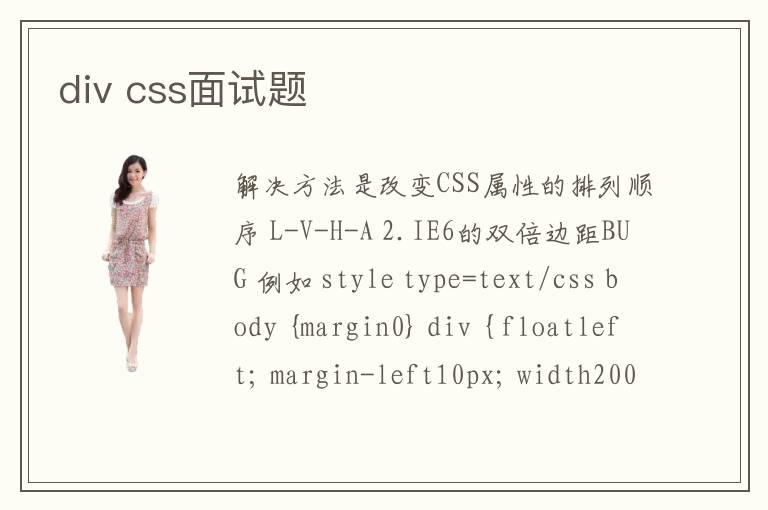 解决方法是改变CSS属性的排列顺序 L-V-H-A 2.IE6的双倍边距BUG 例如 <style type="text/css"> body {margin0} div { floatleft; margin-left10px; width200px; height200px;