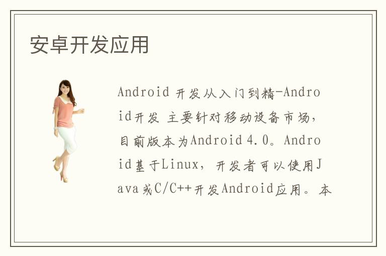 Android 开发从入门到精-Android开发 主要针对移动设备市场,目前版本为Android 4.0。Android基于Linux,开发者可以使用Java或C/C++开发Android应用。本专题将为大家详解