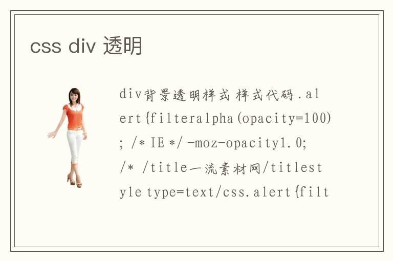 div背景透明样式 样式代码 .alert{filteralpha(opacity=100); /* IE */ -moz-opacity1.0; /* /><title>一流素材网</title><style type="text/css">.alert{filteralpha(opacity=100); /* IE */ -