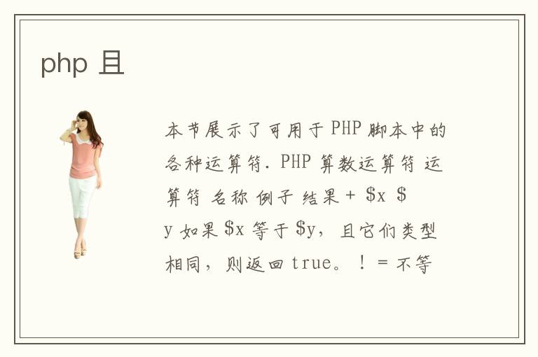 本节展示了可用于 PHP 脚本中的各种运算符. PHP 算数运算符 运算符 名称 例子 结果 + $x $y 如果 $x 等于 $y,且它们类型相同,则返回 true。 != 不等于 $x != $y 如果 $x