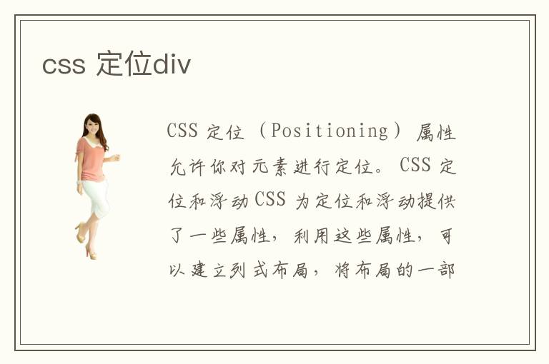 CSS 定位 (Positioning) 属性允许你对元素进行定位。 CSS 定位和浮动 CSS 为定位和浮动提供了一些属性,利用这些属性,可以建立列式布局,将布局的一部分与另一部分重叠