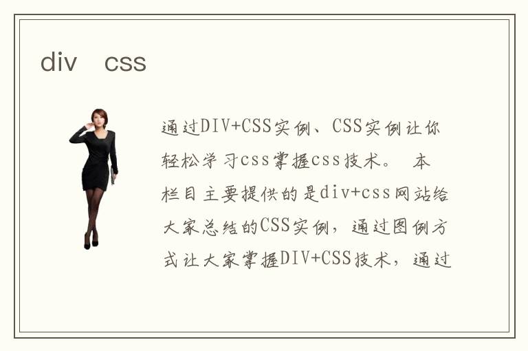 通过DIV+CSS实例、CSS实例让你轻松学习css掌握css技术。 本栏目主要提供的是div+css网站给大家总结的CSS实例,通过图例方式让大家掌握DIV+CSS技术,通过这些DIV+CSS实例