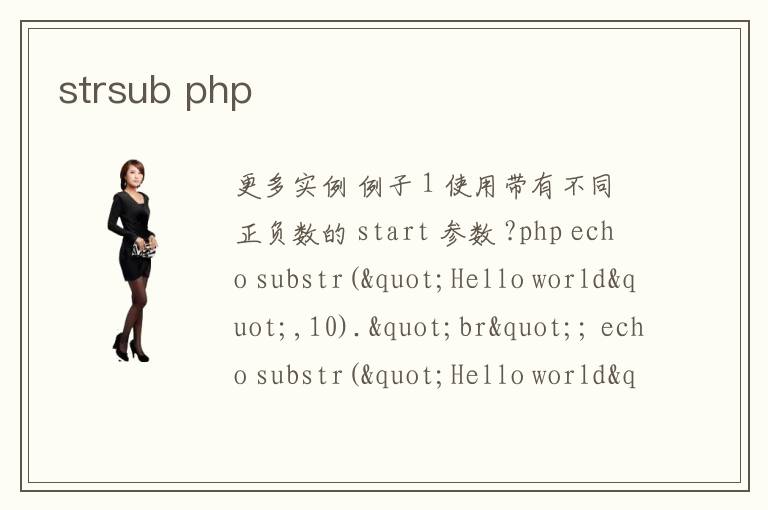 更多实例 例子 1 使用带有不同正负数的 start 参数 <?php echo substr(\"Hello world\",10).\"<br>\"; echo substr(\"Hello world\",1).\"<br>\"; echo substr(\"Hello world\",3).\"<br>\"; echo