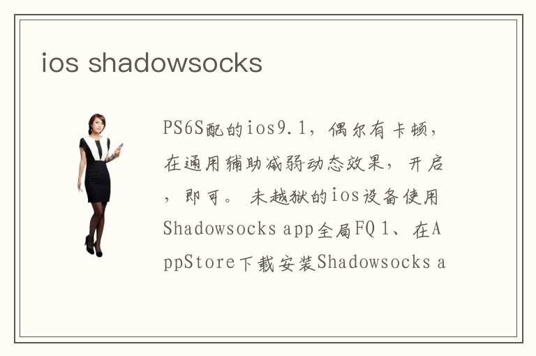 PS6S配的ios9.1,偶尔有卡顿,在通用>>辅助>>减弱动态效果,开启,即可。 未越狱的ios设备使用Shadowsocks app全局FQ 1、在AppStore下载安装Shadowsocks app,打开