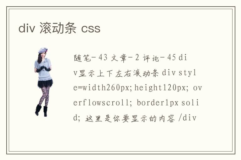 随笔- 43 文章- 2 评论- 45 div显示上下左右滚动条 <div style="width260px;height120px; overflowscroll; border1px solid;"> 这里是你要显示的内容 </div> div显示上下滚动条的css