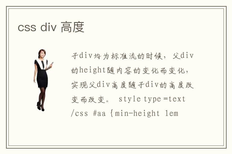 子div均为标准流的时候,父div的height随内容的变化而变化,实现父div高度随子div的高度改变而改变。 < style type ="text/css" > #aa { min-height 1em ; } #bb { height 55px ; }