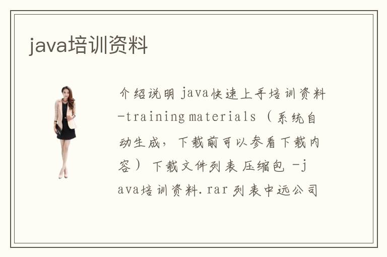 介绍说明 java快速上手培训资料-training materials (系统自动生成,下载前可以参看下载内容) 下载文件列表 压缩包 -java培训资料.rar 列表中远公司--JAVA培训资料.