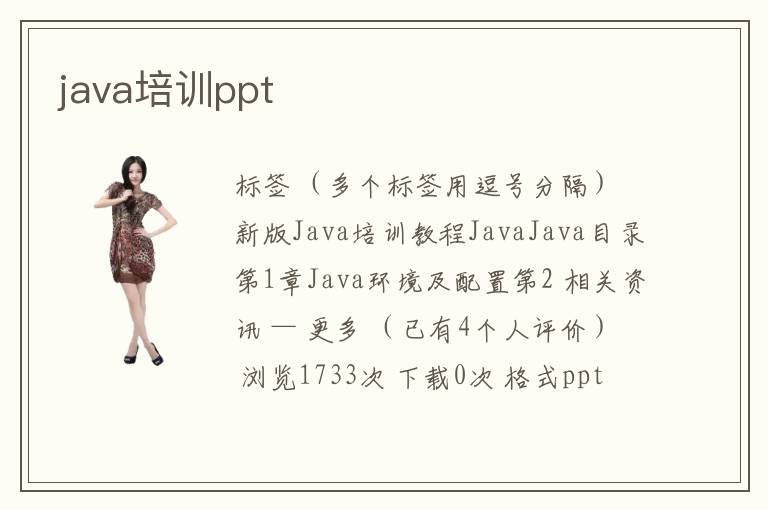 标签 (多个标签用逗号分隔) 新版Java培训教程JavaJava目录第1章Java环境及配置第2 相关资讯 — 更多 (已有4个人评价) 浏览1733次 下载0次 格式ppt 次浏览