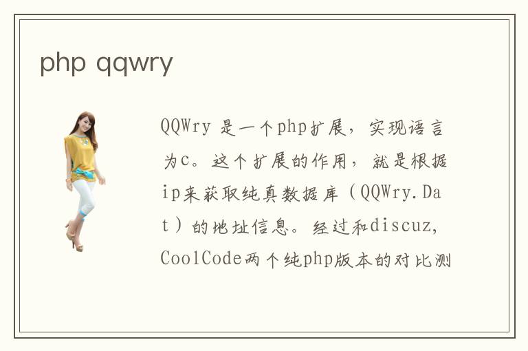 QQWry 是一个php扩展,实现语言为c。这个扩展的作用,就是根据ip来获取纯真数据库(QQWry.Dat)的地址信息。经过和discuz,CoolCode两个纯php版本的对比测试,这个c实现