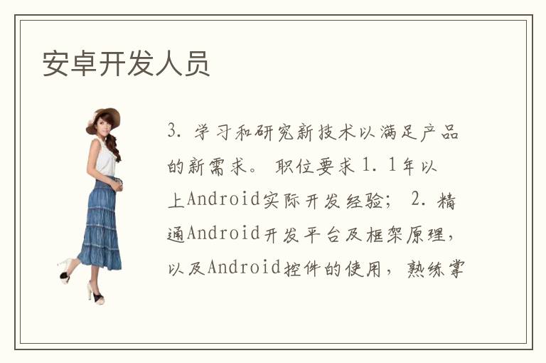 3. 学习和研究新技术以满足产品的新需求。 职位要求 1. 1年以上Android实际开发经验; 2. 精通Android开发平台及框架原理,以及Android控件的使用,熟练掌握Android界