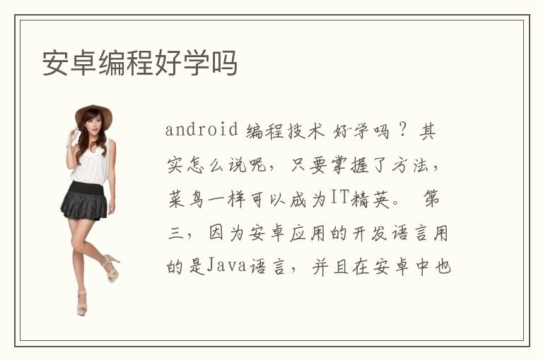 android 编程技术 好学吗 ?其实怎么说呢,只要掌握了方法,菜鸟一样可以成为IT精英。 第三,因为安卓应用的开发语言用的是Java语言,并且在安卓中也用到了Java核心类库的