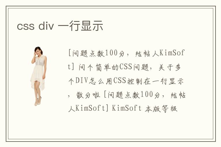[问题点数100分,结帖人KimSoft] 问个简单的CSS问题,关于多个DIV怎么用CSS控制在一行显示,散分啦 [问题点数100分,结帖人KimSoft] KimSoft 本版等级 本版专家分
