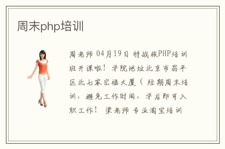周老师 04月19日 特战旅PHP培训班开课啦!学院地址北京市昌平区北七家宏福大厦( 短期周末培训,避免工作时间,学后即可入职工作! 梁老师 专业淘宝培训-7年运营经验-1