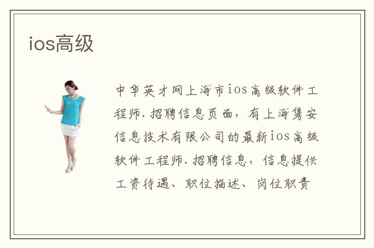 中华英才网上海市ios高级软件工程师.招聘信息页面,有上海隽安信息技术有限公司的最新ios高级软件工程师.招聘信息,信息提供工资待遇、职位描述、岗位职责、工作内容、工作