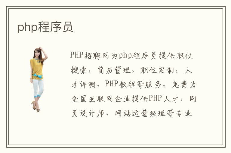PHP招聘网为php程序员提供职位搜索,简历管理,职位定制,人才评测,PHP教程等服务,免费为全国互联网企业提供PHP人才、网页设计师、网站运营经理等专业人才,欢迎用