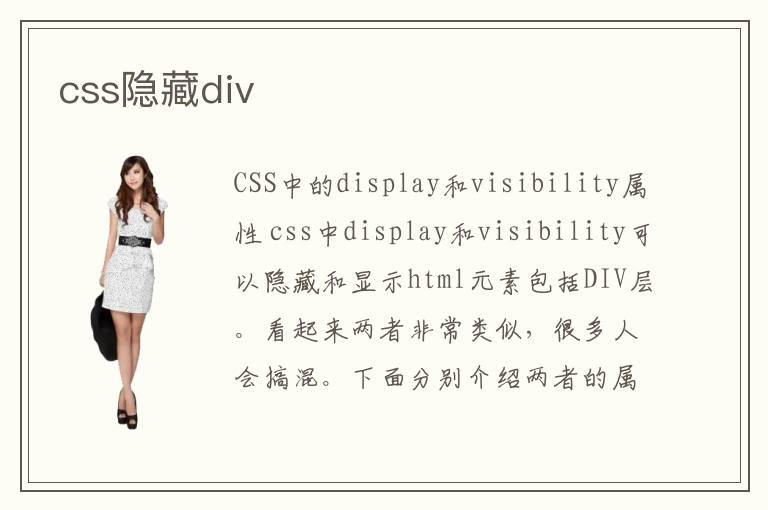 CSS中的display和visibility属性 css中display和visibility可以隐藏和显示html元素包括DIV层。看起来两者非常类似,很多人会搞混。下面分别介绍两者的属性 displaynone|block;