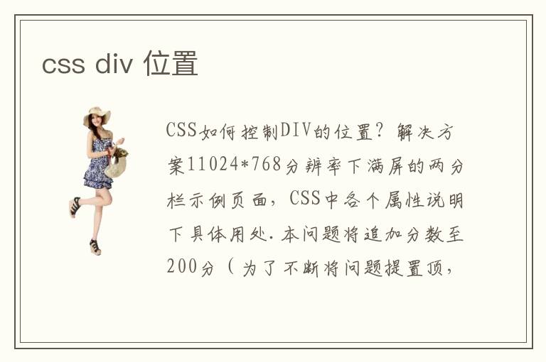 CSS如何控制DIV的位置?解决方案11024*768分辨率下满屏的两分栏示例页面,CSS中各个属性说明下具体用处.本问题将追加分数至200分(为了不断将问题提置顶,结贴前补