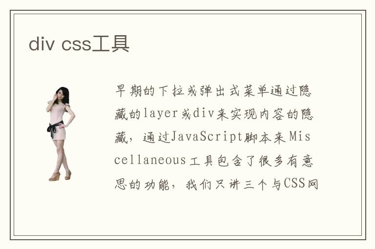 早期的下拉或弹出式菜单通过隐藏的layer或div来实现内容的隐藏,通过JavaScript脚本来 Miscellaneous工具包含了很多有意思的功能,我们只讲三个与CSS网页布局开发有关系