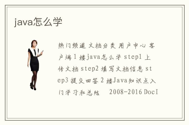 热门频道 文档分类 用户中心 客户端 1 楼java怎么学 step1 上传文档 step2 填写文档信息 step3 提交回答 2 楼Java知识点入门学习和总结 ©2008-2016 DocIn.com Inc. All Rights