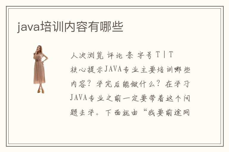 人次浏览 评论 条 字号 T | T 核心提示JAVA专业主要培训哪些内容?学完后能做什么?在学习JAVA专业之前一定要带着这个问题去学。下面就由“我要前途网 JAVA专业主要培