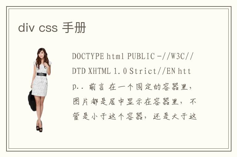 DOCTYPE html PUBLIC -//W3C//DTD XHTML 1.0 Strict//EN http.. 前言 在一个固定的容器里,图片都是居中显示在容器里,不管是小于这个容器,还是大于这个容器.. 其实css