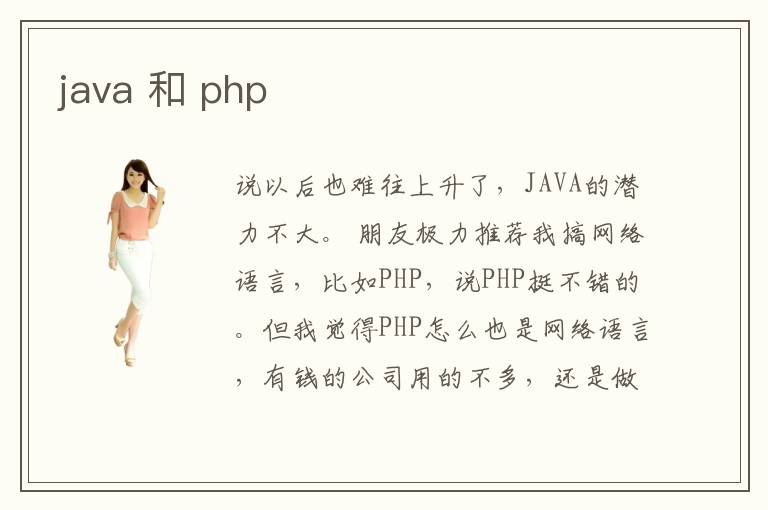 说以后也难往上升了,JAVA的潜力不大。 朋友极力推荐我搞网络语言,比如PHP,说PHP挺不错的。但我觉得PHP怎么也是网络语言,有钱的公司用的不多,还是做软件发展比较