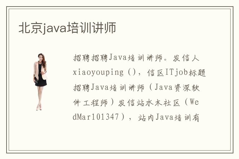 招聘招聘Java培训讲师。发信人xiaoyouping(),信区ITjob标题招聘Java培训讲师(Java资深软件工程师)发信站水木社区(WedMar101347),站内Java培训