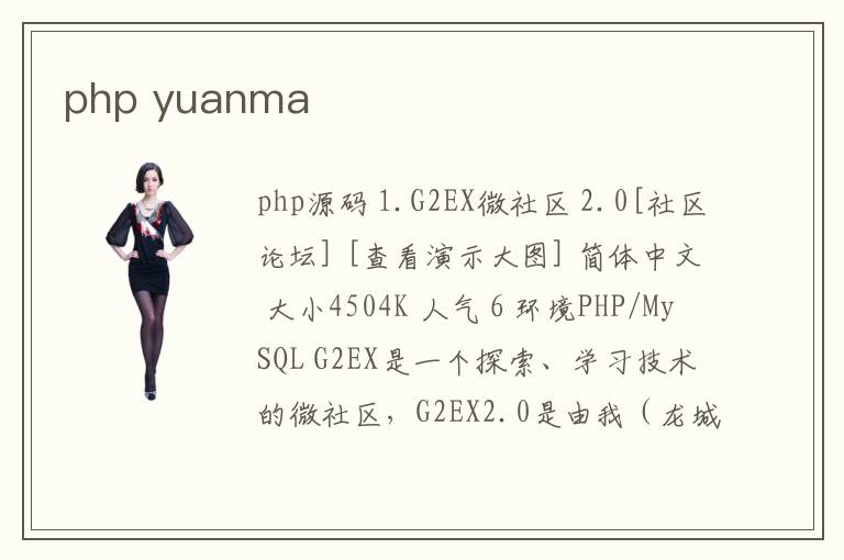 php源码 1.G2EX微社区 2.0[社区论坛] [查看演示大图] 简体中文 大小4504K 人气 6 环境PHP/MySQL G2EX是一个探索、学习技术的微社区,G2EX2.0是由我(龙城男人)在