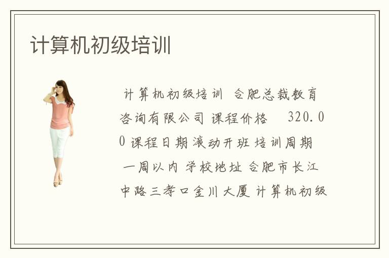< 计算机初级培训 > 合肥总裁教育咨询有限公司 课程价格 ¥320.00 课程日期 滚动开班 培训周期 一周以内 学校地址 合肥市长江中路三孝口金川大厦 计算机初级培训 合肥办公自动