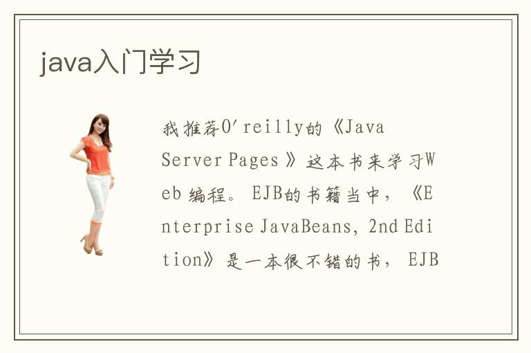 我推荐O\'reilly的《Java Server Pages 》这本书来学习Web 编程。 EJB的书籍当中,《Enterprise JavaBeans, 2nd Edition》是一本很不错的书, EJB的学习门槛是比较高,入门很