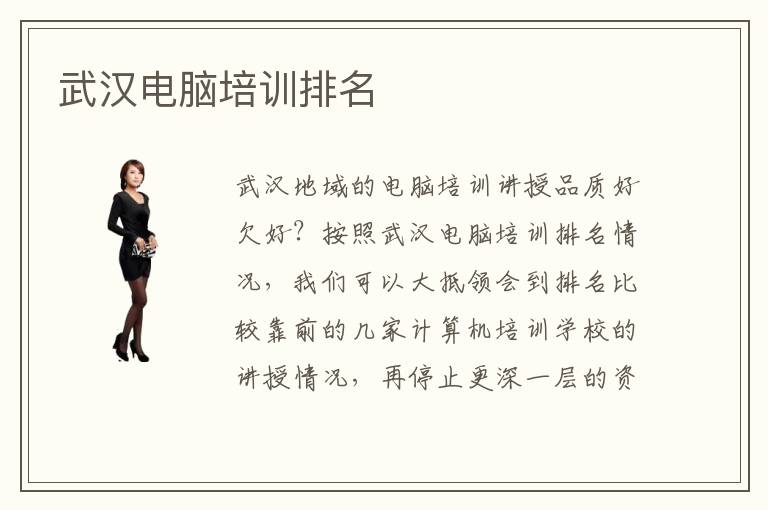 武汉地域的电脑培训讲授品质好欠好?按照武汉电脑培训排名情况,我们可以大抵领会到排名比较靠前的几家计算机培训学校的讲授情况,再停止更深一层的资料查阅,可以官方地晓得一些眼前计算机培训学校的行情,议决实地访问,加倍威望地领会到口碑,而后晓得武汉电脑计算机培训学校的上风在哪里,领会学校的办学背景、办学理念等,以便更好地接管优良的教育。武汉电脑培训电脑培训排名推荐电脑学校