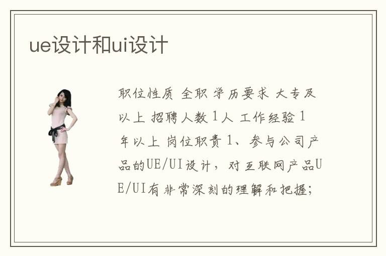 职位性质 全职 学历要求 大专及以上 招聘人数 1人 工作经验 1年以上 岗位职责 1、参与公司产品的UE/UI设计,对互联网产品UE/UI有非常深刻的理解和把握; 2、充分理