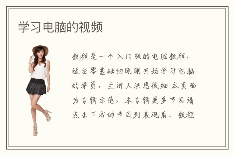 教程是一个电脑入门教程,适合零基础的刚刚开始学习电脑的电脑新手,主讲人洪恩很细 网络聊天等。 新手学电脑系列更多教程 如果你已经有了一定的电脑基础,推荐你