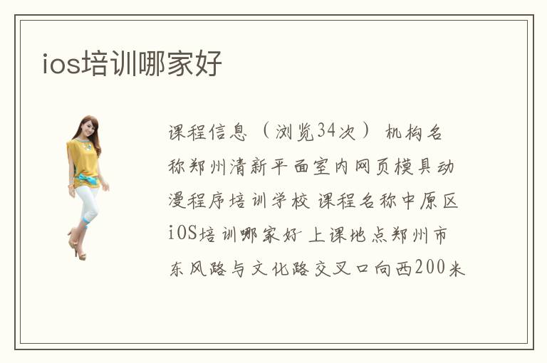 课程信息 (浏览34次) 机构名称郑州清新平面室内网页模具动漫程序培训学校 课程名称中原区iOS培训哪家好 上课地点郑州市东风路与文化路交叉口向西200米路北汇宝大