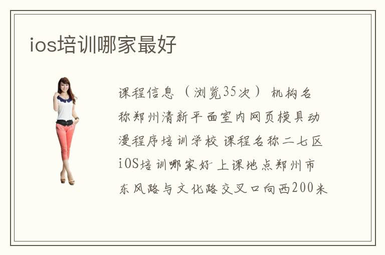 课程信息 (浏览35次) 机构名称郑州清新平面室内网页模具动漫程序培训学校 课程名称二七区iOS培训哪家好 上课地点郑州市东风路与文化路交叉口向西200米路北汇宝大