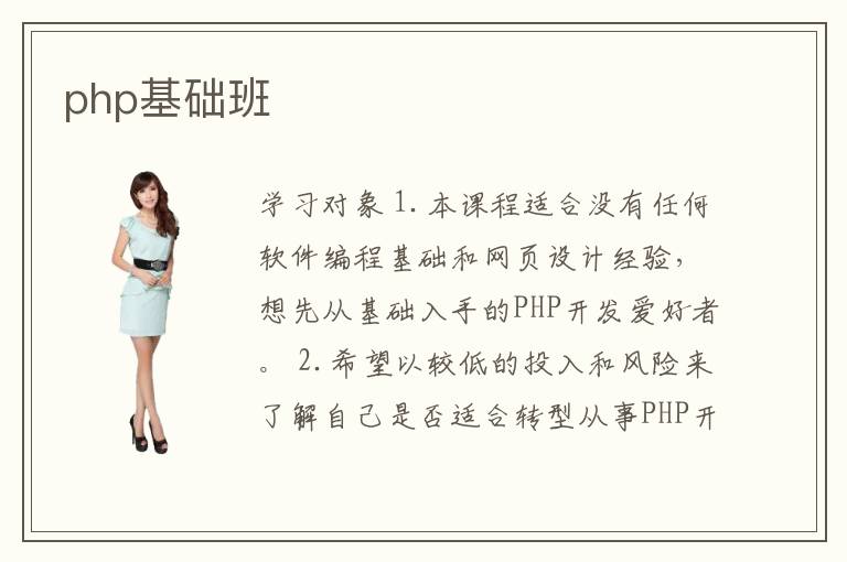 学习对象 1.本课程适合没有任何软件编程基础和网页设计经验,想先从基础入手的PHP开发爱好者。 2.希望以较低的投入和风险来了解自己是否适合转型从事PHP开发的求职人员