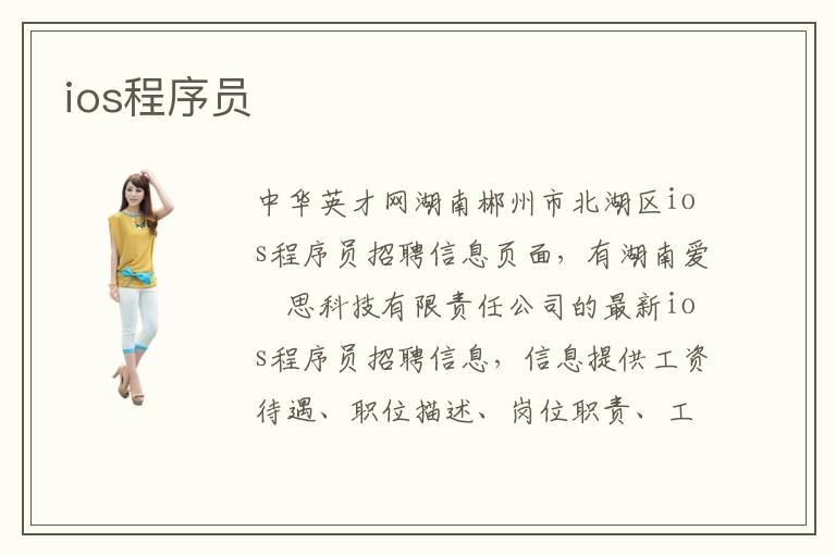 中华英才网湖南郴州市北湖区ios程序员招聘信息页面,有湖南爱愽思科技有限责任公司的最新ios程序员招聘信息,信息提供工资待遇、职位描述、岗位职责、工作内容、工作地点