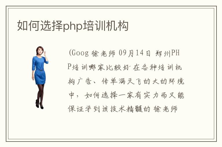 (Goog 徐老师 09月14日 郑州PHP培训哪家比较好 在各种培训机构广告、传单满天飞的大的环境中,如何选择一家有实力而又能保证学到该技术精髓的 徐老师 09月14日 郑州