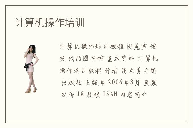 计算机操作培训教程 阅览室 馆友 我的图书馆 基本资料 计算机操作培训教程 作者 周大勇主编 出版社 出版年 2006年8月 页数 定价 18 装帧 ISAN 内容简介 职业技能培
