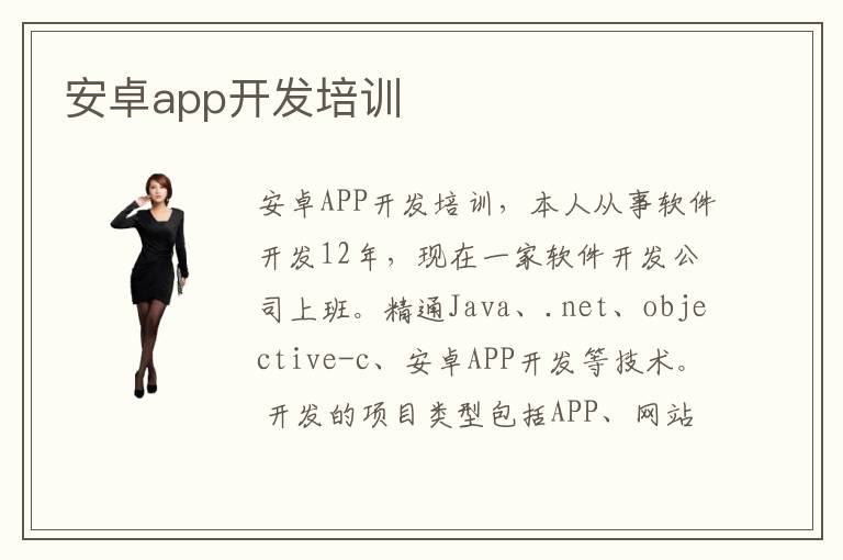 安卓APP开发培训,本人从事软件开发12年,现在一家软件开发公司上班。精通Java、.net、objective-c、安卓APP开发等技术。 开发的项目类型包括APP、网站、应用系统程序等