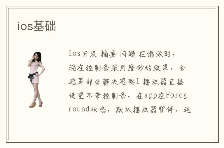 ios开发 摘要 问题 在播放时,现在控制条采用磨砂的效果,会遮罩部分解决思路1 播放器直接设置不带控制条,在app在Foreground状态,默认播放器暂停,这样需要