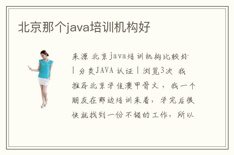 来源 北京java培训机构比较好 | 分类JAVA 认证 | 浏览3次 我推荐北京学佳澳甲骨文 ,我一个朋友在那边培训来着,学完后很快就找到一份不错的工作,所以个人认为那里应该