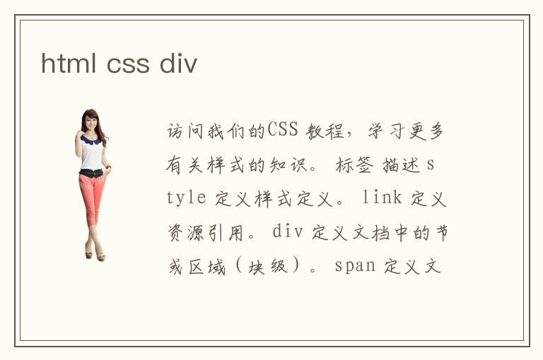 访问我们的CSS 教程,学习更多有关样式的知识。 标签 描述 <style> 定义样式定义。 <link> 定义资源引用。 <div> 定义文档中的节或区域(块级)。 <span> 定义文档中的行内的