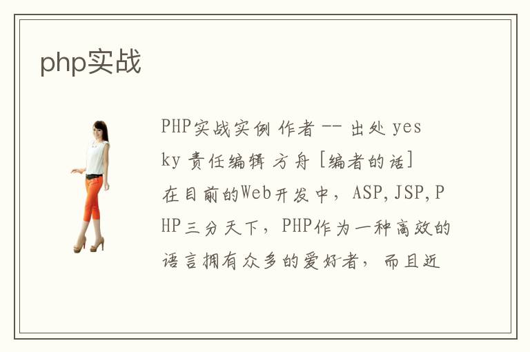 PHP实战实例 作者 -- 出处 yesky 责任编辑 方舟 [编者的话] 在目前的Web开发中,ASP,JSP,PHP三分天下,PHP作为一种高效的语言拥有众多的爱好者,而且近来越来越