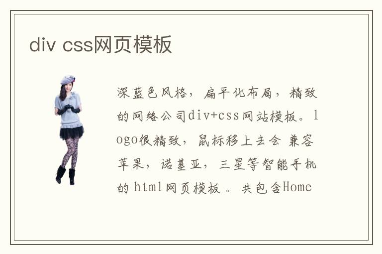 深蓝色风格,扁平化布局,精致的网络公司div+css网站模板。logo很精致,鼠标移上去会 兼容苹果,诺基亚,三星等智能手机的 html网页模板 。共包含Home、About、Gallery、