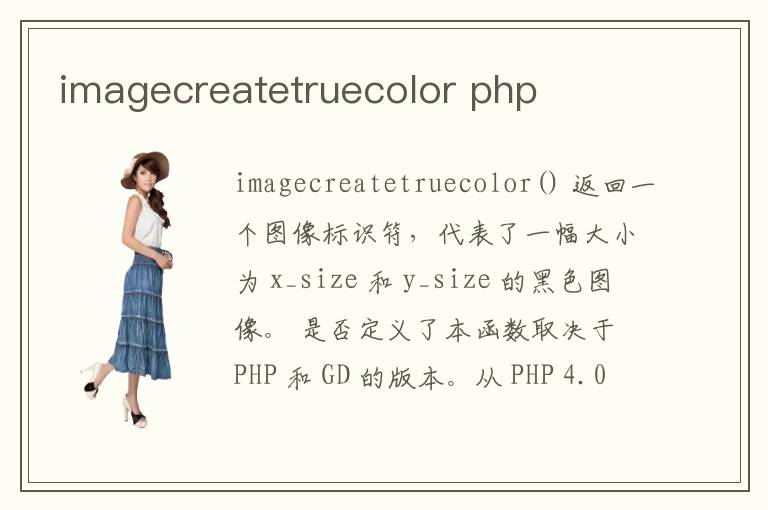 (PHP 4 >= 4.0.6, PHP 5) imagecreatetruecolor — 新建一个真彩色图像 说明 resource imagecreatetruecolor ( int $x_size , int $y_size ) imagecreatetruecolor() 返回一个图像标识符