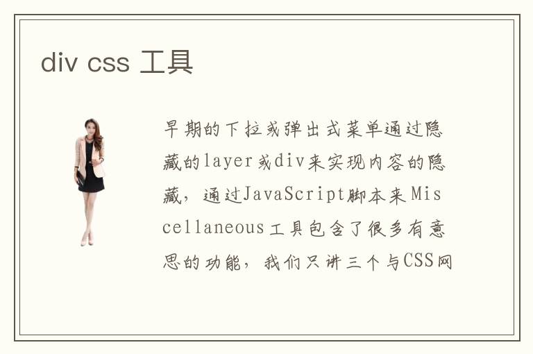 早期的下拉或弹出式菜单通过隐藏的layer或div来实现内容的隐藏,通过JavaScript脚本来 Miscellaneous工具包含了很多有意思的功能,我们只讲三个与CSS网页布局开发有关系