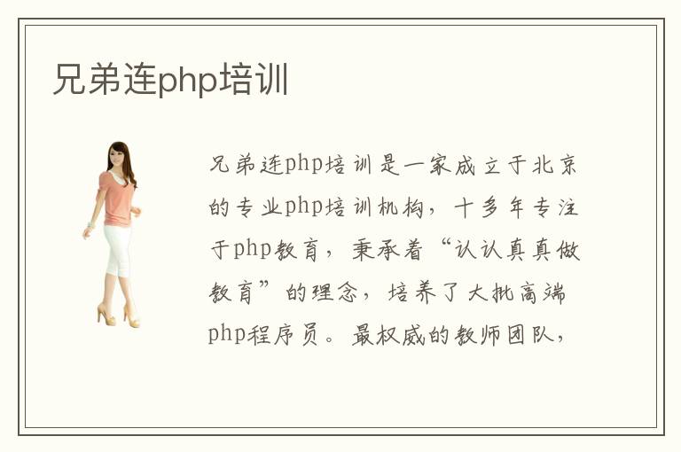 php技术运用的范围很广泛,而最长运用于web网页设计制作这一方面,各种php培训机构数不胜数。那么,兄弟连php培训怎么样呢?兄弟连的教学质量好不好呢?北京兄弟连互联网培训学校是一家具有实力的it培训机构,拥有最权威的教学团队,丰富的校园生活,以小组为一个整体参加各种项目的设计制作,在潜移默化中让学生感受到团队合作的重要性,打造全方面发展的高端php人才。